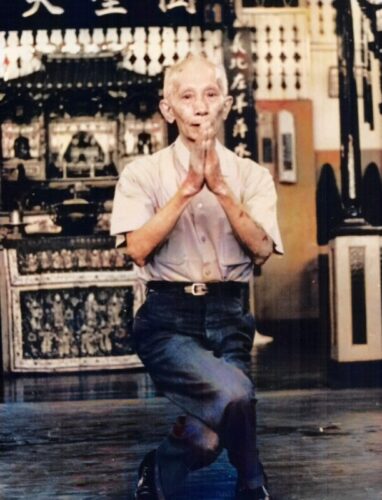 GM Lao Kim started training in a Buddhist Temple in Fujian, China in the 1880s during the Qing Dynasty when he was 6 or 7 years old. Manchu soldiers massacred his family; he was saved because he hid in a latrine. When he emerged from his hiding place, he walked among his dead family. A couple of Buddhist monks who were begging in the village took him to the temple in the mountain. He was adopted by the abbot and since then trained in Buddhism, including a Shaolin style of martial arts that was influenced by the 5-Animal system. The 3 main forms included: Dragon Tiger, Plum Blossom and Red Boy Praying to the Goddess of Mercy.